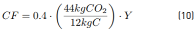 Where CF represents the carbon fixation per hectare of sugarcane in kg CO2/ha; 0.4 is the conversion factor, which is a ratio of carbon in biomass in the photosynthetic reaction, as follows: CO2 + H2O → CH2O + O2; (44 kg CO2/12 kg C) is the ratio of the molecular weight of carbon dioxide to carbon; 𝑌 is the sugarcane productivity per hectare in kg/ha.