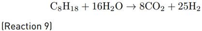 The octane (C8H18) is used as a gasoline surrogate for gasoline processing simulation, and the equations for octane steam-reforming [Reaction 6] and water-gas shift reaction [Reaction 7] are as follow [27,28]: