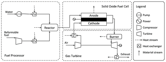 Figure 1 shows a simplified SOFC scheme with a gas turbine. The model described by Facchinetti et al. [17]includes a fuel processor where partial steam-reforming of the fuel occurs, including auxiliary devices (i.e., pump and blowers) and excessive steam to guarantee a reduced rate of degradation of the planar SOFC. The use of heat exchangers is necessary to remove the extra energy generated during the operation of the system. Unused fuel is directed to a burner where it is oxidized, as the expansion of the hot gases activates the turbine, ejecting the exhaust gases into the atmosphere.