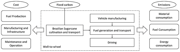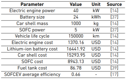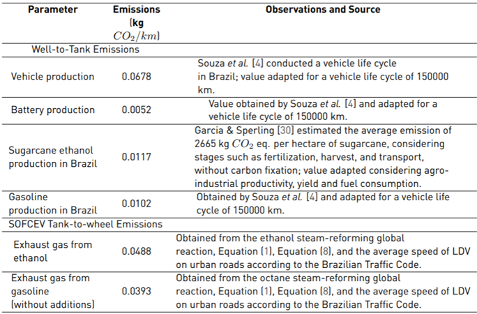 The cost of manufacturing, preparation of infrastructure, as well as maintenance and operation of the SOFCEV were obtained through equations by different authors. The emissions inventory related to the cultivation of sugarcane, generation, and transportation of fuel was prepared based on data available in the literature, specifically for the Brazilian scenario.