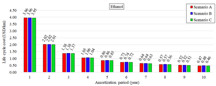This scenario includes the cost of investing in equipment, producing Brazilian fuels, manufacturing, maintaining, and operating the vehicle. This cost will be presented in USD/km, considering anhydrous sugarcane ethanol and gasoline C (73% gasoline and 27% anhydrous sugarcane ethanol on a volume basis) as fuel, during a 10-year amortization period.