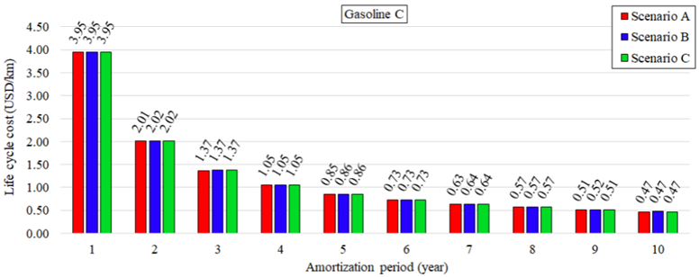 Cost of gasoline C to the consumer equal to 295.49 USD/year in Scenario A [36] and 309.19 USD/year in Scenario C.