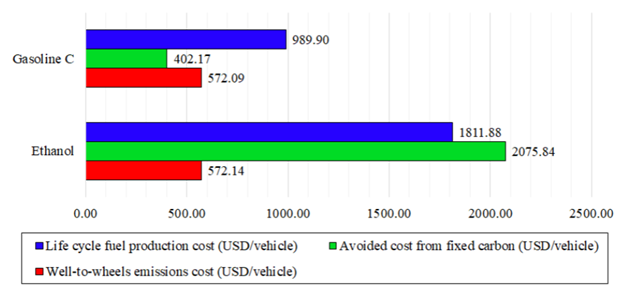 It was possible to state that the SOFCEV fed with sugarcane ethanol reaches neutrality in the carbon cycle, since the avoided cost from fixed CO2 emissions is 1.1 times greater than the cost of WTW emissions. The same is not true for the SOFCEV fuelled with gasoline C, where the emissions cost is 2.5 times higher than the cost avoided by carbon fixation. In 2019, the average price of ethanol production surpassed that of gasoline C, with a tax of 0.02 USD per kg CO2 emitted; the high avoided cost in the production of Brazilian ethanol made the fuel become more competitive than gasoline C, with a production cost of around 308.18 USD/vehicle. This new cost of ethanol production is 3.8 times lower than that observed for gasoline C. Finally, carbon pricing was not sufficient to make the technology more viable for consumers, with an expected NPV of -USD 8006.38 after the 10-year amortization period.
