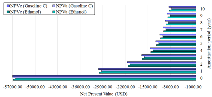 Figure 6 shows the results of economic feasibility for the Brazilian consumer obtained through the NPV method. Initially, as representative of the current scenario, the analysis was carried out without considering carbon pricing (NPVa), followed by an analysis considering the acquisition and sale of carbon credits by the Brazilian fuel sector (NPVc). It is possible to reaffirm the positive effects of carbon pricing under the ethanol chain, since the annual expenditure on ethanol goes from 263.99 USD/year to 144.29 USD/year, while gasoline C goes from 289.47 USD/year to 302.89 USD/year, turning ethanol into a more economically attractive biofuel to consumers.