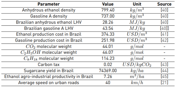 Where Cc represents the total cost of Scenario C, considering the carbon fixed by sugarcane plantations during ethanol production in USD/km. Through Equation (12) the existence of a simplified market for the sale of carbon credits is considered. In this case, it would be possible to sell the credits referring to the fixed carbon value, and thus deduct from the total costs. However, it is assumed that there is no maximum emissions limit for the sector (cap). The additional costs resulting from the operation of the carbon market due to the lack of regulation worldwide have not been considered. In Brazil there are recent sectorial initiatives such as the decarbonization credits from RenovaBio, aimed at the certification of producers and importers of biofuels in the country[12].