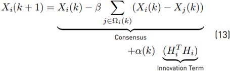 where (i, j) represent neighbouring agents to each other. Ωi denotes the communication neighbourhood of the agent i. α, β > 0 are the adjustment factors or consensus weights and innovation potential, respectively, and are defined by (14):