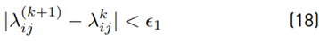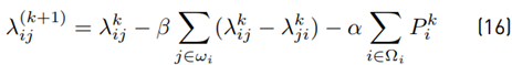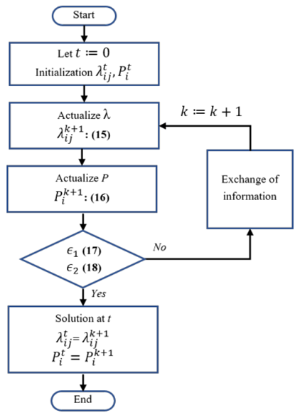 The Lagrange multiplier λij is the estimated price vector of an agent i. The convergence of the price estimate is achieved in the update of Equation (16), through a consensus term corresponding to the conditions of optimality and evidences the coupling between the agent’s Lagrange multipliers. The second term constitutes a term of innovation and ensures the application of the restriction of equality: