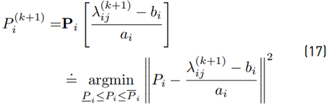 where Pi[·] denotes the projection operator associated with agent i, this operator projects the argument into the space of the feasible solution [P̲i, P̅i], where P̲i = max(P̲i, Pn,−1 + ∆P̲i ) and P i = min(P Gi , Pn ,−1 + ∆P̅ i), that is if the power values are greater than the upper limit (P̅ i ) then the value of Pi(k+1) would be the upper limit and likewise for the lower limit.