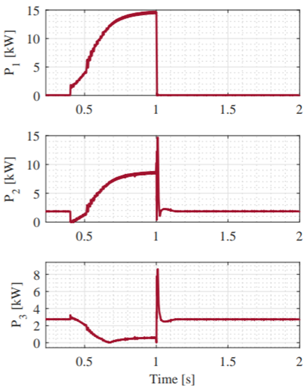 Figures 14 and 15 show the behaviour of the active power of each generator when a communication link is lost, in this case between agents 2 and 3.