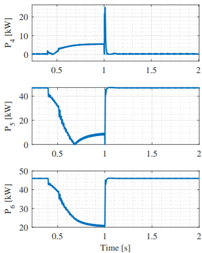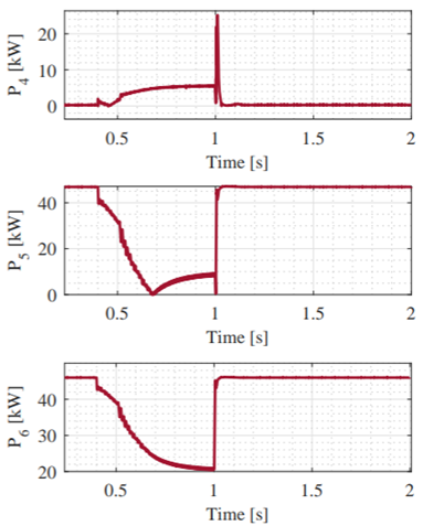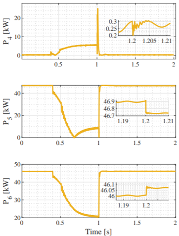 At t = (0.4; 1]s, agents 1, 2 and 4 increased the power generation until 14.34kW, 8,39kW and 5.65kW, respectively. Agents 3, 5 and 6 decreased the power generation by 79.53%, 83.35% and 55.41%, respectively.