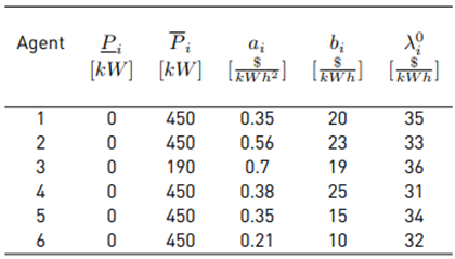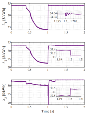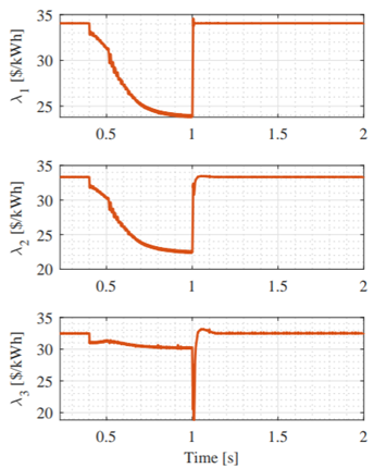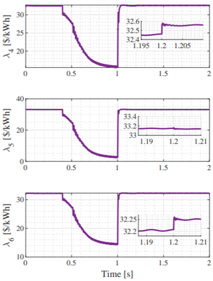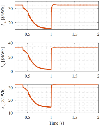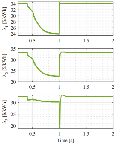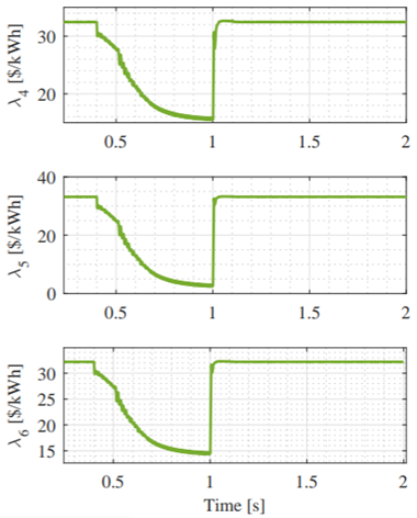 At t = 2s it can be seen that agents 1 and 2 converge at 34.09 $/kWh and 33.35 $/kWh, respectively. Agents 3 and 4 converge to 33.53 $/kWh and 32.46 $/kWh, respectively. Finally, agents 5 and 6 reached the initial cost values, 32.17 $/kWh and 33.21 $/kWh.