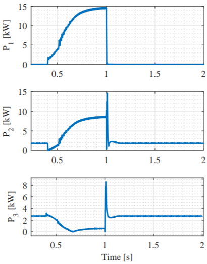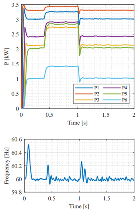 It is observed that the convergence is achieved at a value in each agent, in the first interval t = (0; 0.4]s the agents keep the initial power. In t = (0.4; 1]s the agents 1, 2 and 4 increased the power generation in order to balance the power generation in the connected mode, increasing the generation until 14.59kW for the agent 1, 8.71kW for the agent 2, and 5.44kW for the agent 4. Agents 3, 5 and 6, on the contrary, they reduced their power generation by 78.79%, 78.73% and 55.61%, respectively.