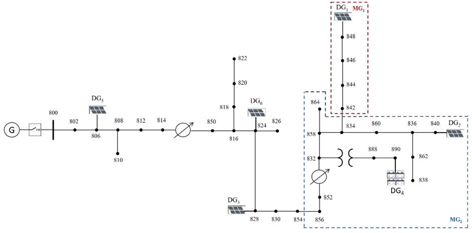 The test system in Figure 2 is derived from an IEEE 34 nodes test feeder, the DGs are located at nodes 848, 840, 828, 806 and 824, the BESS is placed at the node 890.