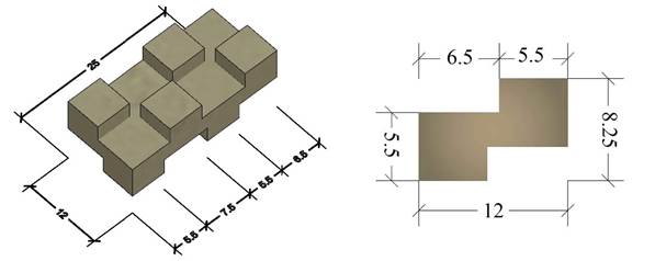 The block with conventional geometry (CG) is a solid masonry brick with rectangular geometry, with all its flat faces and smooth surfaces. The new block with non-conventional geometry (NG) is based on the patent registered by Carrillo and González [10]. Figure 1 shows the geometry and dimensions of the NG block. The NG block is categorized as an unreinforced solid masonry unit with protuberances that emerged from its central core's upper and lower faces, which allows the masonry units to be coupled and interlocked with each other, avoiding relative displacement between units. Because the new block is solid and has smooth surfaces, it was designed to include a 1 cm gap in its central core and cavities so that the masonry units can be joined with mortar or another bonding material. As shown in Figure 1, the NG block is assembled by a rectangular central core with length, width, and height of 250×120×27.5 mm, respectively, from which four staggered protuberances emerged on each upper and lower face. The length, width, and height of the protuberances are 55×55×27.5 mm, respectively. The new block aims to control relative displacements between masonry units and dissipate energy by friction during seismic events. The details of the design, elaboration of the new block, and tests execution are reported by Vargas [12].