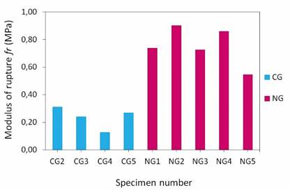 The tests of flexural bond strength of masonry beams are one of the most illustrative tests of the study because they provide evidence of the deformation capacity of the blocks interacting as a construction system. Figure 10shows the modulus of rupture of beams with CG and NG blocks when subjected to flexural bending. While handling the masonry specimens to the testing machine, two beams made of CG blocks fractured prematurely; one of the beams was the specimen for the preliminary test, and the other was the prism N1. In addition, the beam N4 made of CG blocks fractured prematurely during preload of the test machine. On the other hand, all the beams made with NG blocks did not fracture precipitately and the mechanical tests were carried out. Kyriakides and Billington [26] also reported that two of five conventional block beams also fractured before testing.