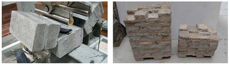 In-situ construction of prisms and beams with NG blocks is facilitated due to the geometry of the blocks, which allows the masonry units to be easily coupled and interlocked with each other, avoiding relative displacement between units. The NG units must be hydrated 1% more than the CG before assembling the prisms and beams regarding the manufacturing and construction recommendations. This step prevents the blocks from extracting water from the mortar joints, reducing bonds and promoting shrinkage cracks. It is recommended to use a thicker rectangular central body during compression strength tests of the NG block to avoid fractures through the protuberances. For instance, it is recommended to perform the compression test of the NG using steel cubes or some transfer load material on the upper and lower faces of the block, in that way to avoid fractures through the vertices and to evaluate the strength in a condition similar to the block acting in the wall.