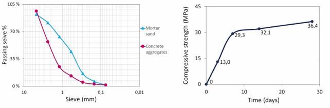 Table 3 shows the gradation curves of the sand used for the joint mortar. Figure 2a shows the gradation curve of the sand for mortar; this curve complies with the percentage of aggregates finer than 75-μm (# 200) sieve that is prescribed by NTC-2240 [15]. The fineness modulus (FM) of the sand for joint mortar is 2.97, which categorizes the grain as a coarse sand. Figure 2b shows the increase of the compressive strength of the joint mortar from the time of assembling the prisms until reaching 28-days age. As shown in Figure 2b, the mean value of the 28-day compressive strength of the joint mortar was 36.4 MPa. The fluidity of the mortar mix (cement-sand) was 109% and categorized the mortar as one with plastic consistency. The compressive strength and fluidity of the joint mortar meet the requirements defined in Section D.3.4.1 of NSR-10 [11] and NTC-3329 [16], respectively.
