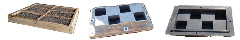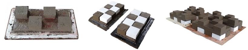 In the study, 400 CG blocks and 300 NG blocks were used for manufacturing the test specimens. As shown in Figures 3a and 3b, wooden molds coated with lacquer and wooden molds with fiberglass were assembled for casting the CG and NG blocks, respectively. The bottom of the protuberances in the lower part of the mold is completely sealed, while the protuberances at the top of the mold are 55×55 mm open holes. The length, base, and internal height of the two parts of the mold are 250×120×13.75 mm. Dimensions of the protuberances are 55×55×27.5 mm. As shown in Figure 3c, the mold is assembled using a male-female connection system on the interior side. In the central-longitudinal zone, the mold includes 1.5 cm outer cantilevers for adjusting and closing the mold by four screws with a washer nut (one for each side of the mold). Figure 4 shows the fabrication procedure of the NG blocks.