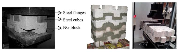 Capping of the prisms was carried out on the upper and lower faces of each CG and NG prisms, using the same mortar used to join the masonry units. In the case of NG prisms, the mortar cap filled the gaps between the protuberances of the blocks. The masonry prisms were centered between two steel flanges which are located at the top and bottom of the specimen. The entire assembly is then placed into the MCC8 testing machine by verifying the vertical alignment with the center of the load testing machine. Two displacement transducers with a capacity of 50 mm were used to record the longitudinal axial displacement of the prisms and then compute the axial strain.