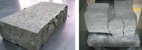 As shown in Figure 11a, during testing of flexural bond strength, the beams with CG block were split into two pieces, and all the joint mortar kept adhered to one side of the beam. Although the beams with NG blocks were also divided into two pieces, the split of the blocks occurred between some of the protuberances of blocks and the mortar joints (see Figure 11b). Table 8 shows that the mean values of the modulus of rupture (fr ) were 0.24 MPa for beams with CG blocks and 0.75 MPa for NG blocks; that is, the bond between NG units is approximately three times greater than that of CG units.