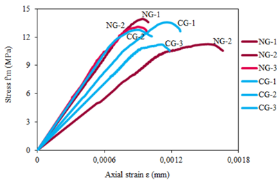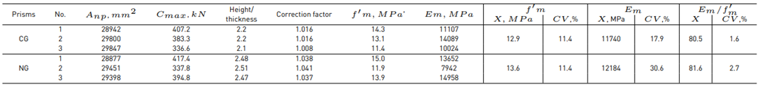 An analysis of variance (ANOVA) was carried out in this study to identify the similitudes or differences of the relation Em/f´m for the CG and NG prisms. In ANOVA, a variable factor was considered to have a significant effect if 𝑃-value was found to be lower than 0.05 (95% confidence level). The P-value was 0.85, that is significantly greater than 0.05, which means that there is not a difference between the relation Em/f´m for CG prisms and NG prisms.