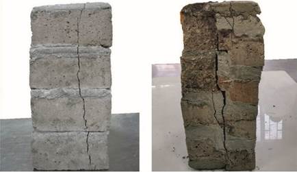 Table D.3.7-1 of the NSR-10 [11] prescribes a slenderness (height/thickness) correction factor to evaluate the compressive strength of prisms (f’m ). As shown in Table 6, the slenderness of the prism ranged between 2.0 and 2.5; therefore, slenderness correction factors ranging between 1.0 and 1.04 were used for prisms with CG and NG. Table 6 shows that the mean value of the compressive strength of prisms (f’m ) are 12.9 MPa for CG blocks and 13.6 MPa for NG blocks. Measured values of f’m for the two types of blocks comply with the minimum compressive strength of 13 MPa prescribed by NTC-4026 [22]. As shown in Table 6, the mean value of the modulus of elasticity of prisms (Em ) was 11740 MPa for CG blocks and 12184 MPa for NG blocks, with CVs of modulus of elasticity in this study of 17.9% and 30.6% for CG and NG blocks, respectively. As shown in Figure 7, the NG-2 prism exhibited some voids between the joint mortar and the protuberances, generating compressive strength values, and modulus of elasticity lower than those observed in NG-1 and NG-3. Figures 8a and 8b show well-defined vertical cracks extending from the top to the bottom of the CG and NG prisms. The failures modes exhibited by prisms with CG and NG blocks were similar to the typical behavior reported by Tena and Miranda [23]. They noted that the failure mode characterized by vertical cracks is the typical crack pattern observed in concrete and clay masonry under axial loads and it depends on the interaction between the blocks (stiff material) and the mortar joint (flexible material). The joint mortar voids were observed in 25% of prisms with NG blocks. Flores et al. [24] pointed out that the equation proposed by NTC-M [25] for computing the compressive strength of masonry underestimates the contribution of the mortar joints to strength.