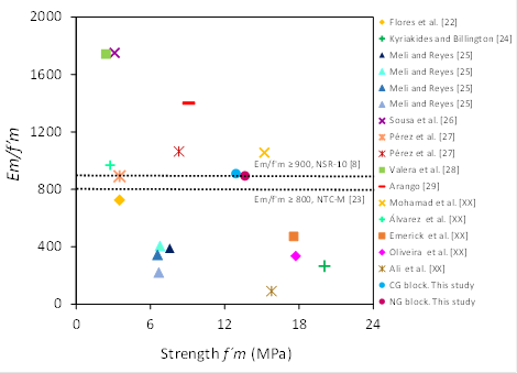 When experimental values of Em are not available, NSR-10 proposes Equation (1) to estimate the modulus of elasticity of concrete masonry. According to Section D.5.2-2 of NSR-10, the Em/f´m ratio must be equal to or greater than 900. The modulus of elasticity of the prisms computed using Equation (1) are 11610 MPa and 12240 MPa for prisms with CG blocks and NG blocks, respectively. Table 7 and Figure 9 show the Em/f´m ratios computed with the values of Em and f´m measured in this study and data reported by different authors for concrete masonry blocks. In this study, Em/f´m ratios were 909 and 894 for prisms with CG and NG, respectively. Flores et al. [24] reported that the variation in the measured values of axial strains and modulus of elasticity are as high as 40% and 51%, respectively. Based on the results measured in this study and data reported in the literature, the modulus of elasticity of prisms seems to depend on the joint mortar, the geometry, dimensions, material, and construction process of masonry units.