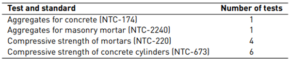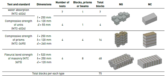 The tests included in the experimental program are those indicated in Section D.3.6 of NSR-10. The tests matrix is summarized in Tables 1 and 2. The study planned the same types and number of tests for NG blocks and CG blocks for comparison purposes. Table 1 shows the global dimensions of the specimens for each test, where l = length, b = width, and d = height of each type of specimen (unit, prism, or beam).