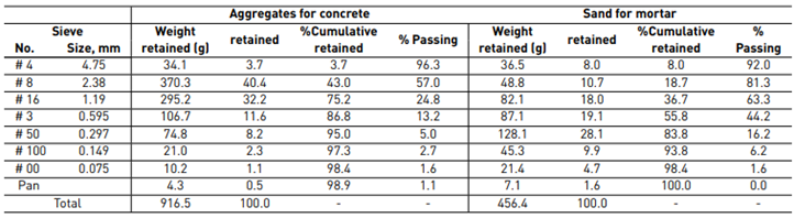 The concrete for casting the blocks includes mixed aggregates (sands and gravels extracted from Cármen de Carupa quarry in Cundinamarca), hydraulic cement, and water, with cement:aggregates ratio of 2:1, and A/C water:cement ratio of 0.48. Table 3 shows the particle-size distribution (gradation) of the aggregates used for the concrete mix. By weight of concrete, the proportion of materials is 23.1% mixed gravel, 42.7% cement, and 34.2% freshwater. The gradation tests aided in categorizing the sands as coarse sands since its fineness modulus (FM) was higher than 3.5, (FM = 4.01). The gradation does not comply with the minimum retained percentage per sieve prescribed by NTC-174 [13]. However, the gradation is acceptable since the compressive strength of concrete complies with the minimum strength of 24 MPa. Figure 2a shows the gradation curve of the aggregates used for the concrete mix. Concrete samples were taken to assess the compressive strength of concrete at 28 days. The height and diameter of the cylindrical samples were 150 mm and 70 mm, respectively. The mean value of the measured compressive strength of concrete (fc ) was 31.1 MPa, with a coefficient of variation (CV) of 1.45%.