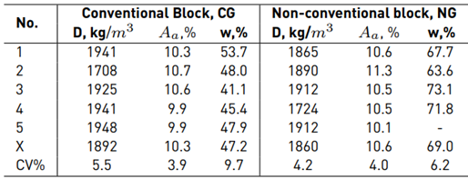 The mean values (X) and the coefficients of variation (CV) were the statistical parameters used in this study to analyze the results obtained during testing. The nomenclature and parameters of mechanical properties measured during testing are described as follows: Aa is the water absorption in %, w is the water content in %, D is the dry density of the block in kg/m³, Rc is the compressive strength of the masonry unit in MPa, Cmax is the maximum compressive load in kN measured during testing of units and prisms, Anp is the average net area for units and prisms in mm2, Em is the modulus of elasticity of the masonry prisms in MPa, f´m is the compression strength of the masonry prims in MPa, fr is the modulus of rupture of the masonry beams in MPa, Ps is the weight of the prism in N, l is the span of the prism or beam in mm, b is the average width of the prism or beam in mm, and d is the height of the prism or beam in mm.
