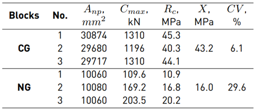 Table 5 shows the mean values X and CV of the compressive strength of the blocks. Table 5 shows that the mean strength Rc is 43.2 MPa for CG blocks and 16.0 MPa for NG blocks. According to NTC-4026 [22], CG and NG blocks are categorized as high-strength masonry units because the compressive strength is higher than 11 MPa. Therefore, these two types of masonry units can be used for structural masonry with solid concrete units, as indicated in section D.3.6 of NSR-10.