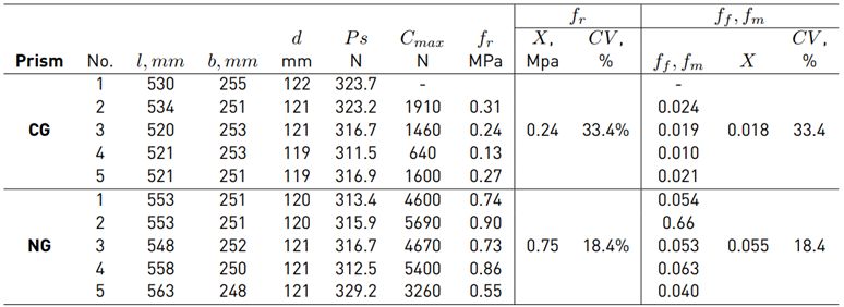 Section D.5.8-1 of NSR-10 prescribes the minimum values of the modulus of rupture for different types of masonry; for example, for solid masonry with type S mortar, fr = 0.41 MPa. Table 8shows that the modulus of rupture of prisms with CG blocks is lower than the value of fr = 0.41 MPa prescribed by NSR-10. Conversely, the bond strength of prisms with NG is 1.8 times higher than the value indicated in NSR-10. An ANOVA test was also carried out in this study to identify the similitudes or differences of the modulus of rupture fr for the CG and NG prisms. The P-value was 1.5?10-5 and is significantly lower than 0.05, which means that there is a difference between fr for CG prisms and NG prisms.
