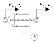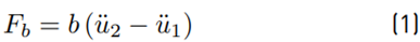 where u1 and u2 are the displacement coordinates perceived by the inerter on its terminals, and the dots over these coordinates represent derivatives in the time domain. In addition, b is the inertance that characterizes the behavior of the inerter.