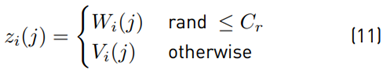 Next, the crossing is applied, generating a zi vector according to Equation (11) that comes from the combination of the vi y wi vector positions subject to a probability of crossing or recombination.