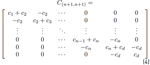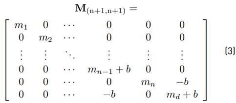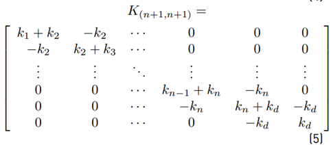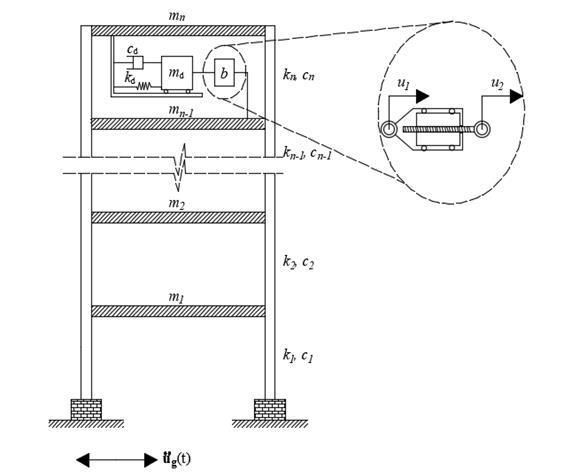 In Figure 3, mi , ki , and ci are the mass, lateral stiffness, and damping of the ith floor (i=1, 2, ... n) and md , kd , cd, and b are the TMDI mass, stiffness, damping, and inertance coefficients. Considering this, the n+1 equations of motion of the resulting MDOF system subject to a base acceleration are written in matrix form as in Equation (2):