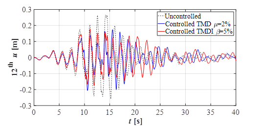 The maximum displacement at the 12th story level (uncontrolled case) caused by seismic excitation is 0.27 m. Now, in Figure 12, using the tuning values derived from the first optimization approach, the maximum displacement is 0.18 m using the TMDI, which represents a 33% improvement in the dynamic response. Moreover, the TMDI exhibit a significant enhancement against the conventional TMD tested herein, for which a 0.21 m peak displacement was obtained, improving just 22% of the response.