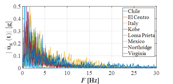 These acceleration records present very diverse frequency content, which results in an ideal condition to achieve a more realistic tuning process. The frequency content is illustrated in Figure 3 using the frequency spectrum of the earthquakes, calculated by applying the Fast Fourier Transform (FFT).