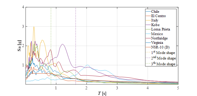 Moreover, Figure 5 below depicts the interaction of the building with the seismic records used as benchmarks in the optimization process, in terms of the first three fundamental periods of the building with the acceleration response spectrum of each accelerogram. It is worth mentioning that the design response spectrum based on the Reglamento Colombiano de Construcción Sismo Resistente, NSR-10 [35] is also included, for a soil type D.
