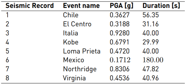 The seismic action is modeled in the optimization process using eight acceleration records, labeled in Table 1 and described by the name of the event, peak ground acceleration (PGA), and duration;