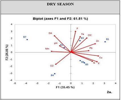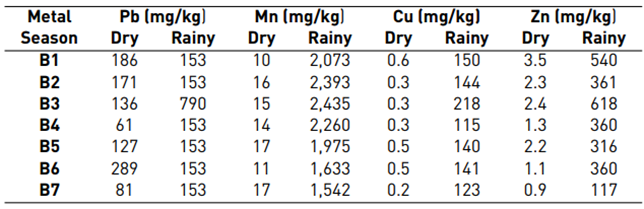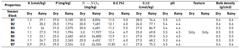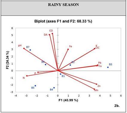 Taking into account the previous results, during the dry season, the concentrations of N-NO3 in each block are high due to excess of fertilizers implemented in the surroundings of the area, as well as a higher OC percentage than during the rainy season. Thus, we can deduce that the soil has a Cu deficiency during the dry season. However, during the rainy season, due to a decrease in the same nutritional element of the soil, the percentages of OC and pH, the availability of metals increases.