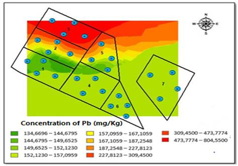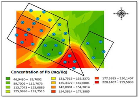 The Kriging method allowed for the interpolation of the distribution of Pb concentrations obtained for both sampling seasons [Figure 5]. During the dry season, we observed that the southern side of the field had the highest Pb concentration because the degree of elevation in the area is greater, specifically, in blocks one and six [Figure 5]. However, during the rainy season, the highest range concentrations of Pb move northward, where there is a steep inclination of the area, between blocks two, three, and five, which had the greatest contact with the underground water well [Figure 6].