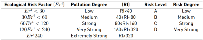To estimate and quantify the risk that an adverse effect can generate on the integrity of ecosystems, the Potential Ecological Risk Index was determined using formulas 2-4 [13]. Equation (2) is the contamination factor of a single element. Equation (3) represents the potential ecological risk factor of a single element, and Equation (4) is the comprehensive potential ecological risk index.