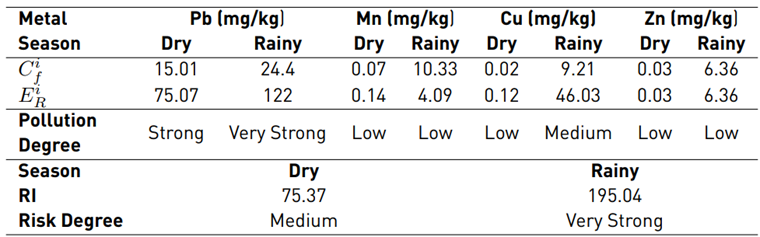 However, Pb is the main element closely linked to the RI, as identified by the values determined by the index, generated by the overall increase of its concentrations in the soil under study, as well as concentrations of the other metals that were present.