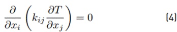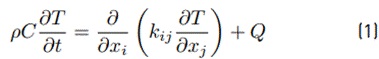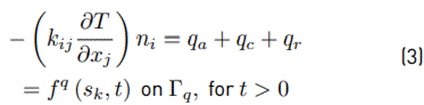 where T is the temperature, ρ is the density of the material, C is the specific heat, kij is the conductivity tensor, and Q is the internal heat generation per unit volume. The terms i, j=1,2,3 are subindices for a three-dimensional (3D) domain. The position vector is x and the time is t. Equation (1) is a second-order differential equation that is part of a boundary value problem (BVP) with the boundaryconditions described in Equation (2) and Equation (3).
