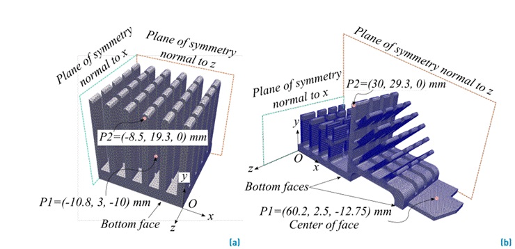 As usual in the FEA, it is necessary to ensure that the results are in the convergence zone; that is, the results are independent of spatial discretization. For this, different meshes are constructed for each geometry by varying the density of finite elements and tracking the change of some response variables. For brevity, the detailed convergence analysis is not presented for all cases; however, as an example, Figure 1 shows the finite element meshes for both heat sinks and the spatial points P1 and P2, which are taken as a reference for the convergence measurements of the temperature field, the heat flux and the verification with commercial software.