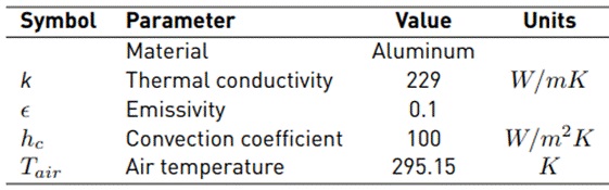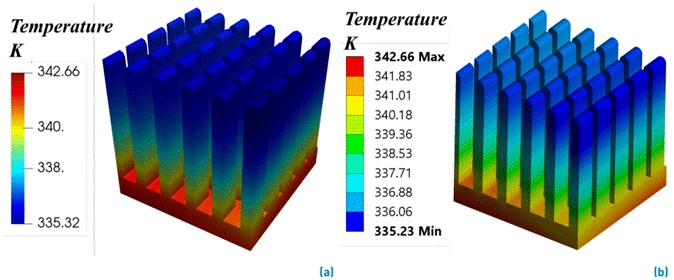 The modeling of heat sinks considering their most basic form involves calculating the temperature field and the quantification of the heat dissipation by radiation and convection. For the purposes of this study, the analysis is performed at a steady state (thermal conditions do not vary in time), and the interaction of the heat sink with the air around it is implemented by assigning the respective boundary conditions of convection and radiation to the environment, limiting the domain to the structural field (air is not explicitly modeled, only its heat dissipation effect).