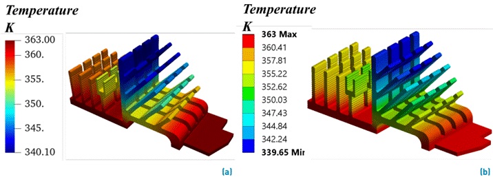 Similar to Case A, the temperature distribution and heat fluxes of reactions are calculated for Case B. However, in Case B, the heat source is imposed with a temperature on the bottom face and not with a heat flux (see Table 1]. The temperature distribution follows a pattern similar to that of Case A, which is higher on the bottom face of the heat sink and follows a vertical temperature profile that depends on the effect of convection and radiation to the ambient for Case B. For Case B, convergence in temperature and heat flux is achieved for a mesh of 76,095 second-order tetrahedral finite elements (meshes with more than 2 million finite elements were evaluated, but they are not shown due to space limitations). The number of finite elements is lower than that of Case A because of the order of the tetrahedra (10 nodes per finite element instead of 4 nodes) and because the geometric complexity of the microchannel heat sink is such that it allows measurement in reference points further away from the singularity effects of the edges. In a homologous way to Case A, Figure 3 shows the temperature distribution for the microchannel heat sink (Case B), with open-source tools and commercial software, again verifying the implementation of the model. In this case, the temperature at the reference points for both methodologies converged to 𝑇 𝑃1 =362.95 K and 𝑇 𝑃2 =341.58 K. For Case B, the energy balance is such that 55.15 W are dissipated to the environment by convection and 0.43 W by radiation, and when comparing the sum of both with the reaction on the surface on which the temperature is imposed (55.48 W), an error less than 0.2% is obtained.