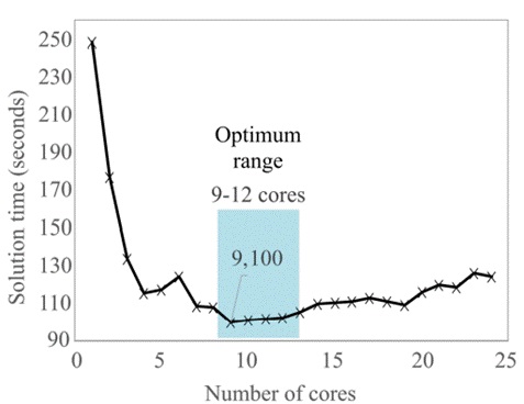 Firedrake is a mathematical tool that, without being aimed at a specific application, has been strengthened with a large number of solution spaces and solvers, allowing it to solve problems of high complexity (such as nonlinearity or mixed spaces). Thus, a linear solver is used for Case A and a nonlinear solver for Cases B and C (due to the radiation boundary condition). Because the problems modeled here do not have solver instability characteristics, the default methods work correctly; that is, GMRES (Generalized Minimal Residual Method) for the linear solver and SNES (Scalable Nonlinear Equations Solvers) Newton line search as a nonlinear solver. Parallel processing has been naturally incorporated into Firedrake, due to the high compatibility of its solver PETSc with different MPI libraries (such as MPICH and OpenMPI). The scalability of HPC strategies depends on the configuration of the MPI software, as well as the hardware that is used. Here, a comparison is made of the solution time of Case B against the number of cores running.