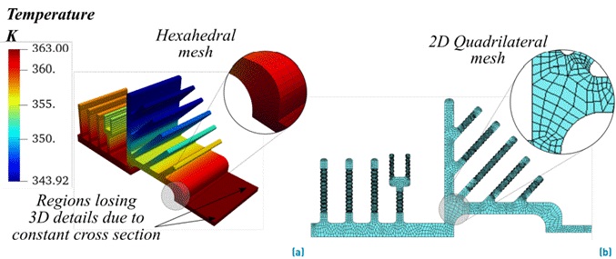 As shown in Table 1, the boundary conditions for Case C are equivalent to those of Case B. The main difference is that the finite element mesh for Case C is structured with first-order hexahedral finite elements, which is obtained by extruding a quadrilateral mesh (2D) in the length of the heat sink, at a distance equivalent to that of the 3D model (23.5 mm for a quarter of the geometry), with 20 layers in the extrusion direction, for a total of 190,200 first-order hexahedral finite elements. Verifying this result with commercial software is not considered necessary because a temperature distribution similar to that of Case B is expected. Thus, Figure 5 shows the temperature distribution for the microchannel heat sink with hexahedral mesh, as well as the 2D mesh that is the basis of the model. It can be observed that the thermal phenomena of convection and radiation to the environment are adequately captured by the hexahedral model, since the temperature distribution is very similar to that of Case B (see Figure 3], although not all the geometric details are incorporated in the length of the sink (when extruding the finite element mesh, it is necessary to keep the cross-section constant).