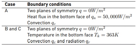 For all cases, two planes of symmetry are considered, so an adiabatic condition is imposed on these surfaces. For Case B and Case C, a temperature boundary condition is imposed on the bottom, and convection and radiation are imposed on the other surfaces. Table 1 shows the boundary conditions for each case. Firedrake is unitless, so it requires maintaining a consistent system of units.